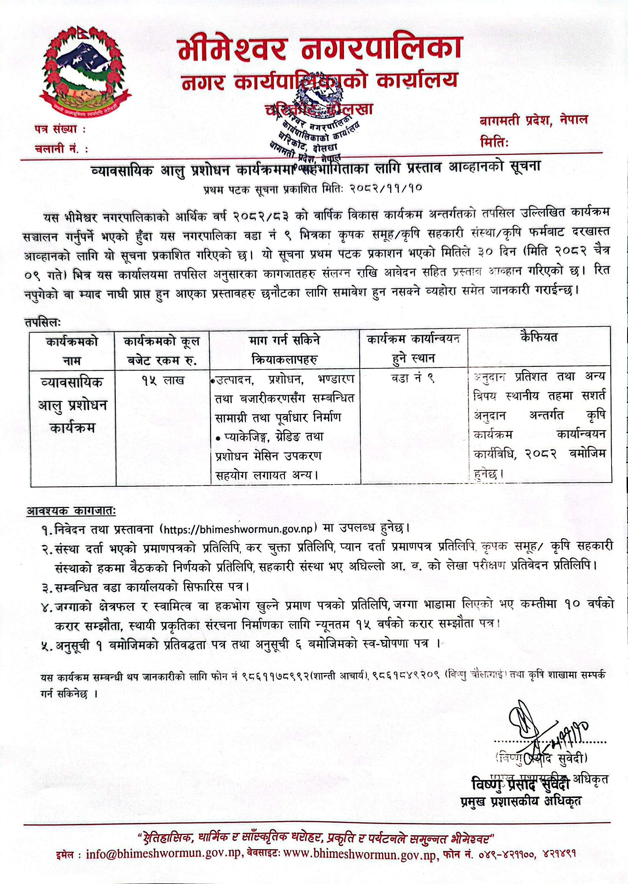 व्यावसायिक आलु प्रशोधन कार्यक्रममा सहभागिताका लागि प्रस्ताव आव्हानको सूचना