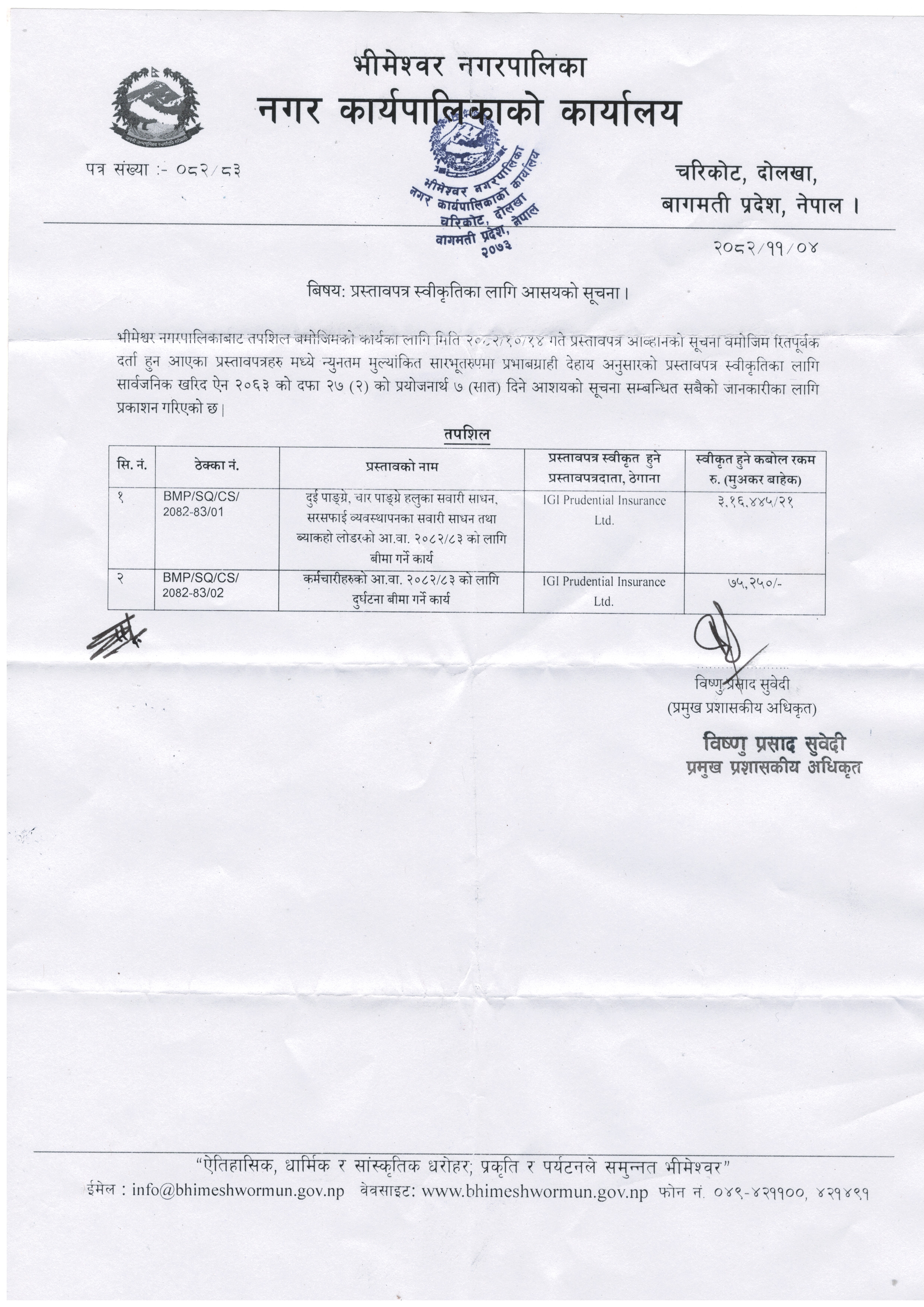 प्रस्तावपत्र स्वीकृतिका लागि आसयको सूचना ।