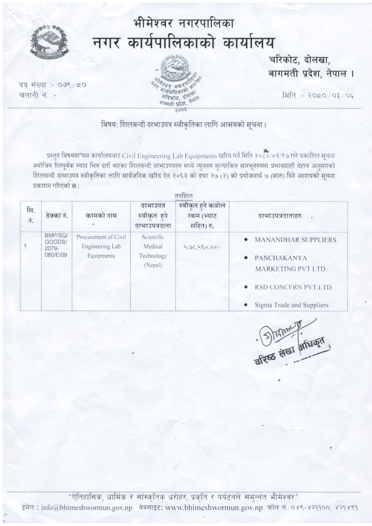 शिलबन्दी दरभाउपत्र स्वीकृतिका लागि आसयको सूचना | (Procurement of Civil Engineering Lab Equipments)