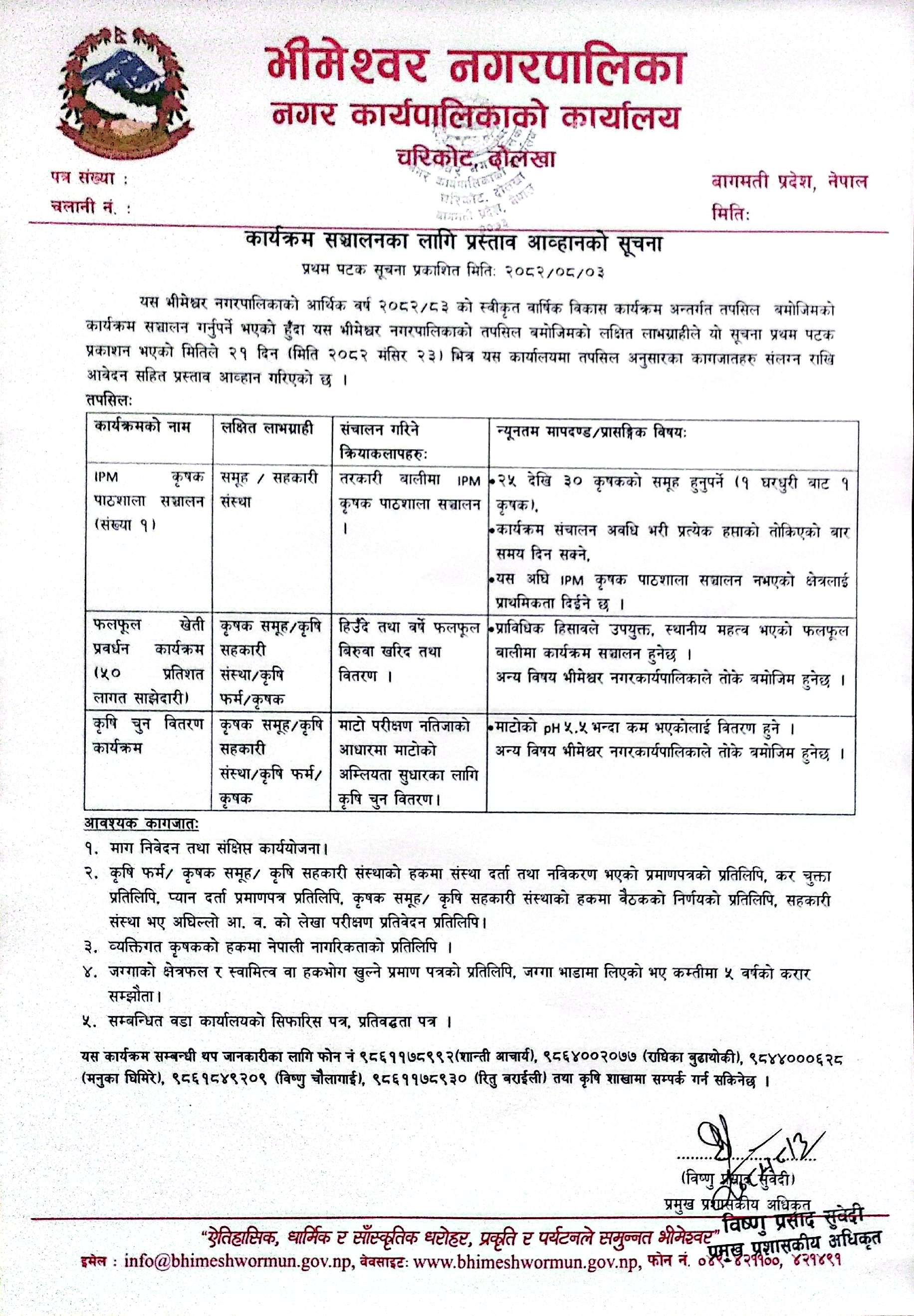 कृषि कार्यक्रम संचालनका लागि प्रस्ताव आव्हानको सूचना ।
