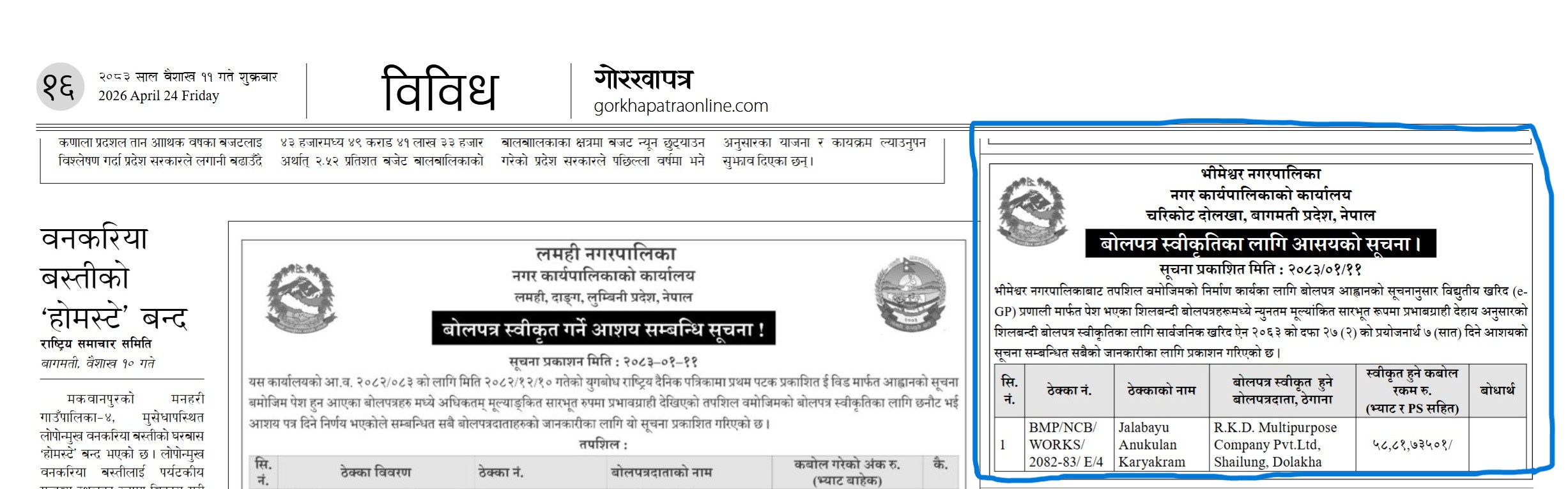 » बोलपत्र स्वीकृतिका लागि आसयको सूचना ।