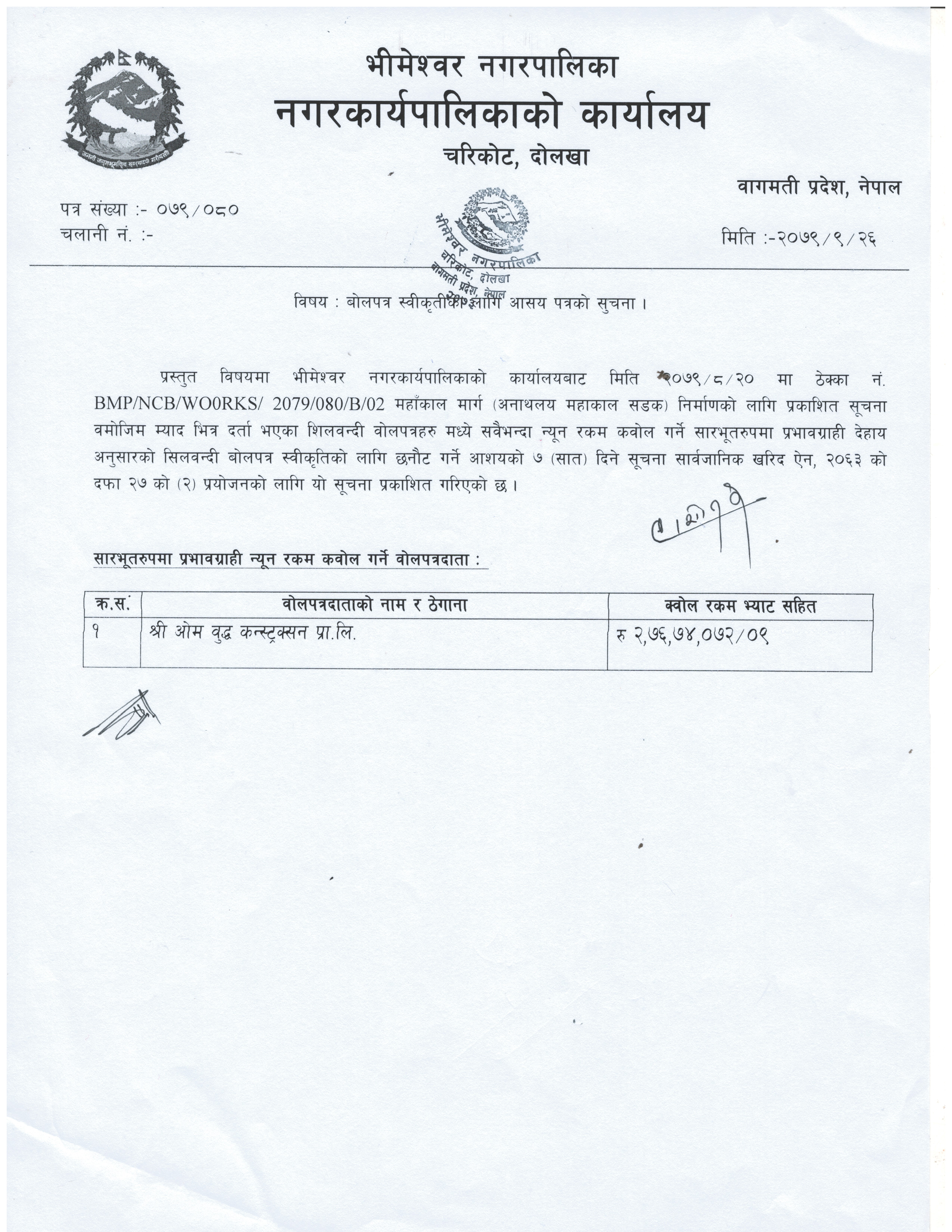 बोलपत्र स्वीकृतीका लागि आसय पत्रको सूचना |