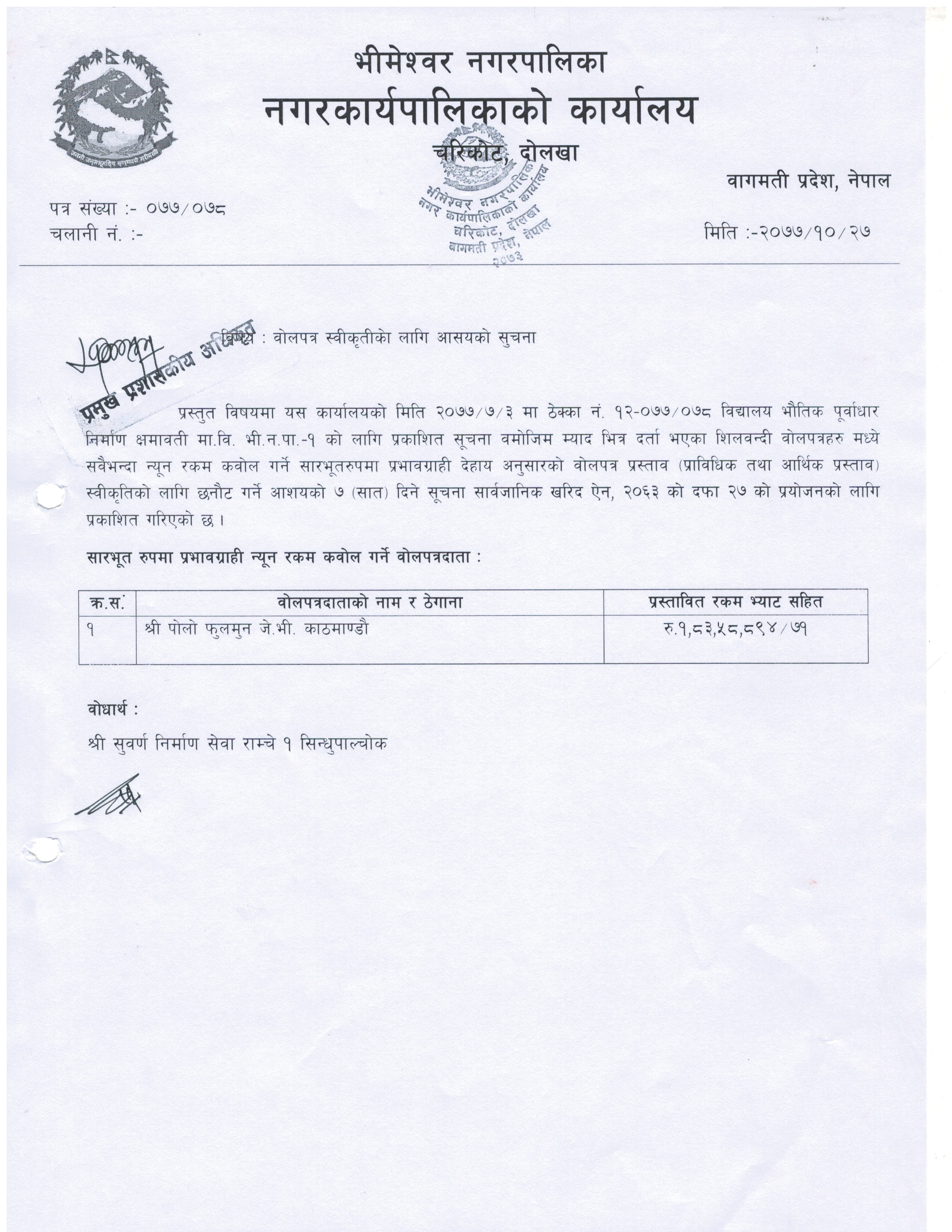वोलपत्र स्वीकृत गर्ने आसयको सूचना |